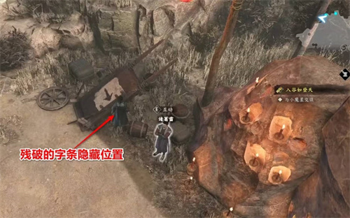 在你进入恶人谷之前,留意箭头指示的附近。这里藏有一张残破的纸条,拾取后将解锁成就“独立思考”。