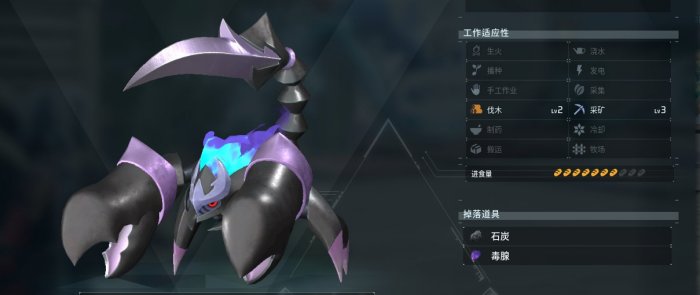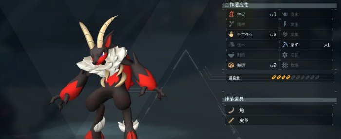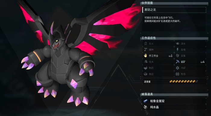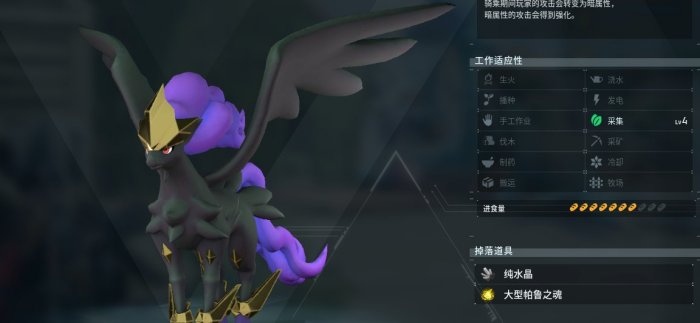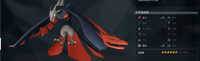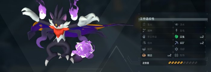很帅并且看上去很强的暗系帕鲁,工种为2手工2搬运+1采矿1生火。
