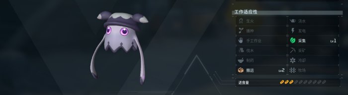 中大体型的四级采集帕鲁,唤兵兽的亚种,古希腊掌管收获的神,由于是暗系的缘故,基本上一只就能满足一般基地的采集需求。