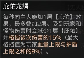 庇佑龙鳞技能,可以每秒向主人施加1层庇佑效果,最多叠加2层,受到伤害时会减少1层庇佑,并格挡该次伤害的15%,最大格挡值=(玩家血量上限+护盾上限)×8%