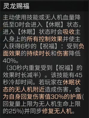 无人机进入休眠状态(敌方视角),在休眠状态中时,守御灵龙无人机会吸收主人身上的控制效果,例如诡异娃娃、混乱效果等,并使得主人获得6秒祝福效果(受到负面效果的持续时长和伤害降低40%)