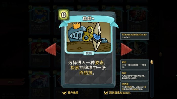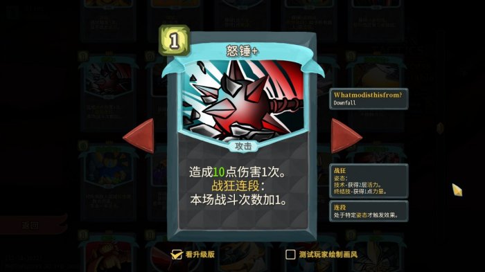 战狂/防守姿态:最核心机制,类似于观者的姿态。每进入一种新的姿态,可以最多用技能牌触发3次技术奖励(弟勇头上的三个槽)。战狂姿态下,技术奖励是增加活力,增加下一次攻击牌的伤害;防守姿态下,技术奖励增加反击,在下一次受到攻击时反伤。想要刷新更多的技术奖励,必须高效进行姿态切换。例如:使用【战斗怒吼】进入战狂姿态,之后使用技能牌时会同时增加活力,但最多触发三次。想要继续触发,需要先退出战狂姿态或切换为防守姿态。