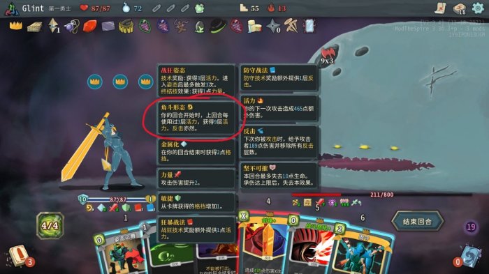 终结技:只能在某一姿态下打出,打出后退出姿态,但会触发姿态终结的额外效果:终结战狂姿态会增加角色1点力量,终结防守姿态会增加角色8点格挡。显然,对于大把大把加的活力,力量对弟勇的加成不重要。但终结防守姿态增加的格挡非常重要!
