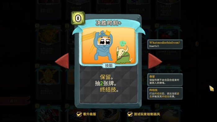 ①决胜时刻:神中神。弟勇的过牌答案!0费、不消耗、保留、抽2张牌,这就是神仙搭配!限制是只能在姿态下才能打出,且打出后会退姿态。这一点限制可以在终极姿态(终极姿态无法退出、同时触发战狂和防守的技术奖励)下克服。必吃敲位,两张即可在终极姿态下无限,第一回合就可完全启动。