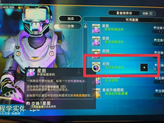 打开商店界面后,需要购买一张类型为外星制图资料的星图,如果有多个导航数据可以多买几张。