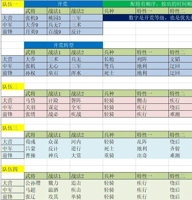 第一队开荒队打架强度都不是很高,建议是开荒以百战月英大乔为核心加速发育,快速拿资源产量,打城皮拿铜币,训练第二队蜀骑打城皮。如果选择周泰开荒,不建议转型大乔,目前唯一解是刘备或者张机的肉步,吴步强度很拉。如果转型砍王,建议曹操神兵大赏点到9级后续转型荀彧法刀,魏延的反计1级后续换其他队伍。