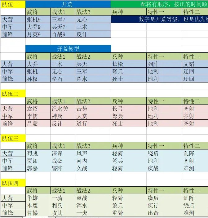 第一队开荒队打架强度都不是很高,建议是开荒以百战月英大乔为核心加速发育,快速拿资源产量,打城皮拿铜币,训练第二队袁绍法刀打架。如果选择周泰开荒,不建议转型大乔,目前唯一解是刘备或者张机的肉步,吴步强度很拉。