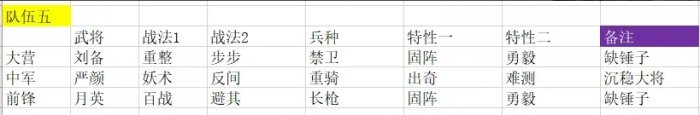 第五队一般是百战或者是双减魏智,在前面使用了战必磐阵魏智,这里就推荐百战蜀步抗线,打流浪军。百战还能组合夏侯惇肉刀,可以看玩家自己的爱好自由调整。
