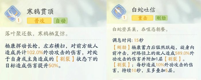 杨康的重击为敌人施加“割裂”debuff,普通攻击则能提升50%对“割裂”目标的伤害