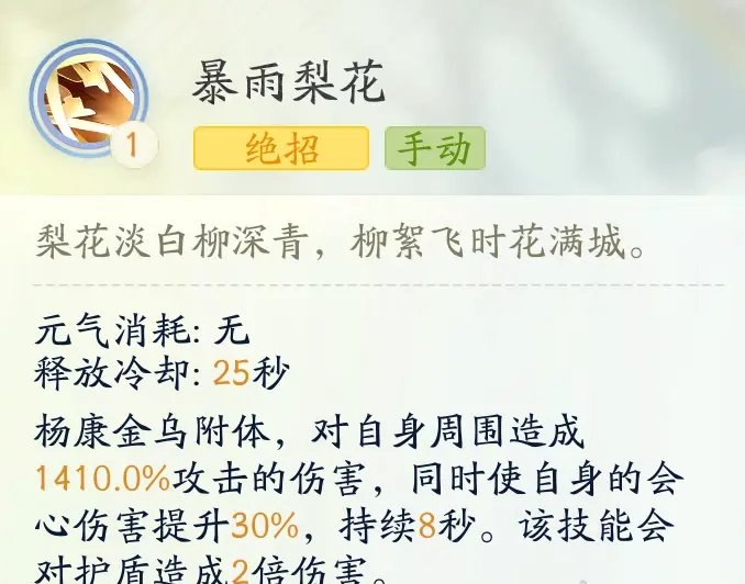 绝招是近战范围攻击并提升自身的会心伤害(对护盾造成2倍伤害)