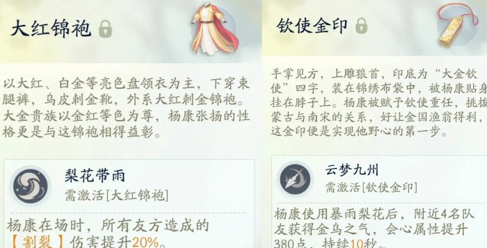 2典“大红锦袍”可以让队友获得割裂技能增伤,4典可以让队友获得会心属性提升