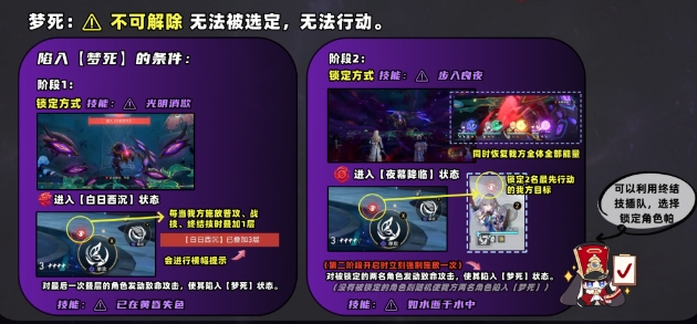 预防【梦死】触发的方式只有一个,也就是在boss抓取我方角色之前将其弱点击破,boss就会直接解除准备状态,在下次释放准备技能后重新锁定;(当然只有第一阶段可以做到)