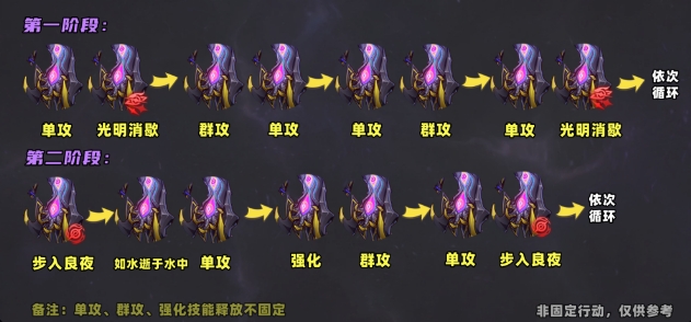 关于何物朝向死亡的行动规律可以看上图,并不唯一,仅供参考;只需要注意第二阶段开始时“步入良夜”技能会直接释放一次即可;