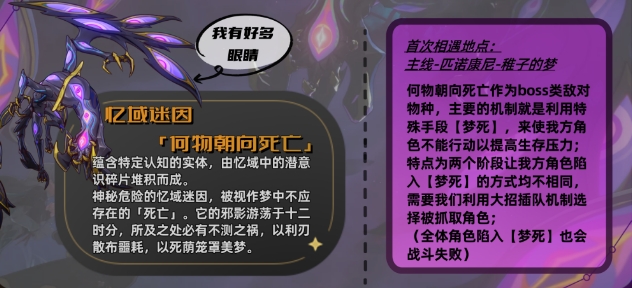 忆域迷因「何物朝向死亡」与大家首次见面是在2.0的剧情中;凭借其压迫感十足的造型氛围、主线剧情关键角色以及特殊的机制让大家印象深刻,当然随着2.0版本的更新,何物朝向死亡也加入了混沌BOSS的行列;首次就作为压轴角色进入了混沌12层,分析价值还是很高的;