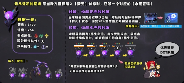 说到【梦死】机制还离不开何物朝向死亡的召唤物-【永眠墓碣】,在boss抓取我方角色时会同时在它的身边形成一个;如果我们想要让陷入【梦死】的角色恢复正常则需要去消灭掉【永眠墓碣】;