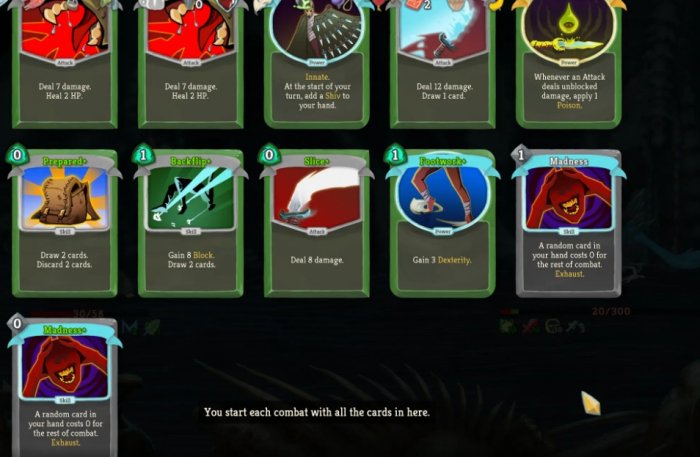 通常情况下,攻击牌会更倾向于即时的战力提升,为卡组提供了直截了当的攻击数值,使得玩家能够更快的击败小怪;而能力牌与技能牌则更注重于卡组的运转与未来强度,过早地抓取这些牌有时甚至会导致卡组的当前战力下降,抓取的时候需要评估卡组战力,是否能够接受这样“战未来”的抓牌。并且抓牌的时候也可以根据当前层的BOSS是谁,抓一些有针对性的对策牌,例如如果是战士鸽,在一层发现BOSS是史莱姆,【火焰吐息】就会是一张很好的对策牌,而【缴械】就会显得无足轻重;但是如果是蹲起怪两张牌的抓位显然就会颠倒过来。当然这样的分类思路还很粗糙,在后续会结合游戏的时期与职业有更具体的说明。