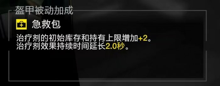 急救包的效果就是让你的治疗剂的上限从4变成6 且你扎针后会有4秒的持续恢复时间,这期间只要你收到非致死伤害你都会回满血,且你的耐力条不会消减。
