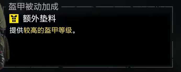 目前只在重甲上有看到这个被动, 这个是在原有的护甲等级上再加一级护甲等级,但是兄弟们要注意,重甲的泛用性极低,多抗一下伤害不如你跑起来打游击战,对于初期熟悉游戏的新兵蛋子可以在低难度加大自己的容错率,千万别穿重甲进高难图,强袭追着你就像猫追小老鼠一样。
