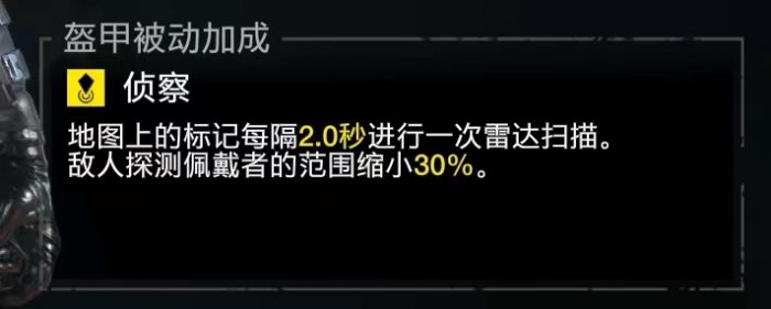 目前所有高难度图老兵的第一选择,在高难度图重甲单位会变多,且玩家收到的伤害也会更高,所以高难图的核心是尽量避免战斗,此被动的效果是缩小敌人发现你的距离,比如以前20m被看到就会发起警报,现在要13m才会有警报。(只是举例 目前没有实际测试过发现距离)用这个被动可以躲避很多不必要的战斗。后期必备。