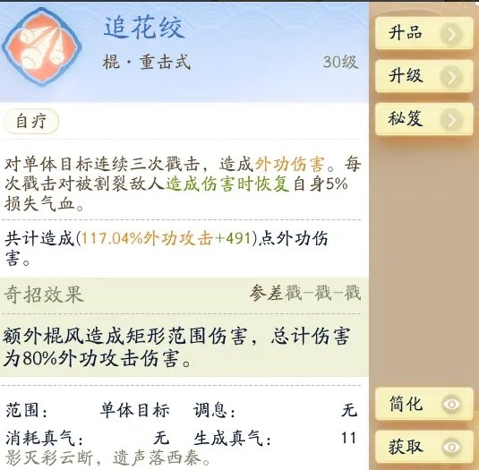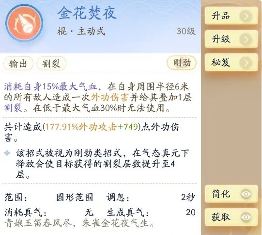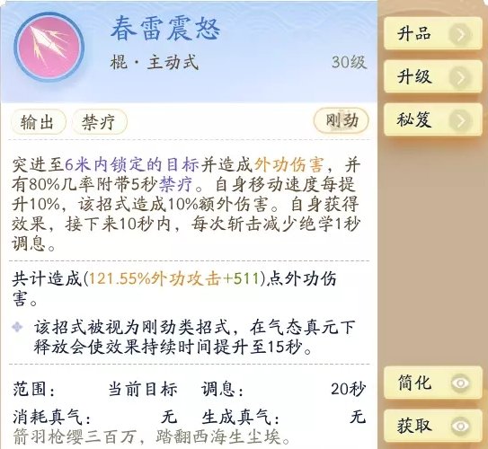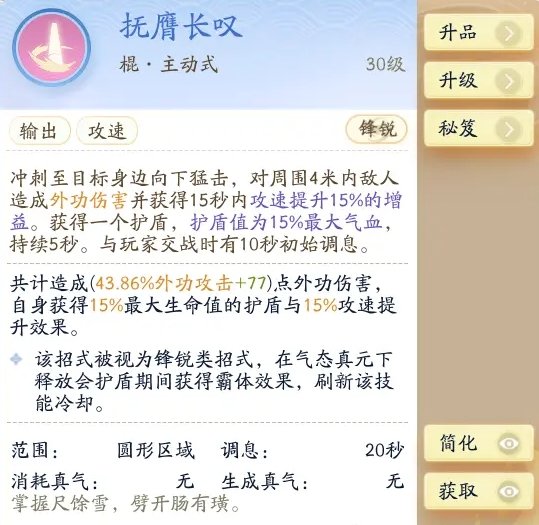 和【直济沧海】可供选择,最后选择了【抚膺长叹】因为它的CD只有20秒,更符合我们用来触发锋锐真元的需求(直济沧海CD为40秒)。