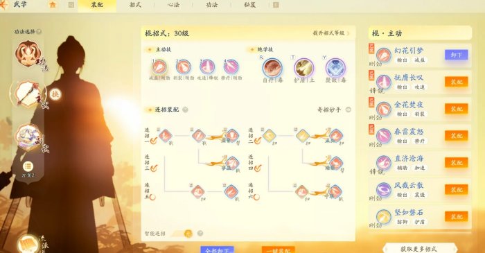 游戏功法可以触发【锋锐毒】和【锋锐土】,因此我们需要一个锋锐主动技能放在3号位置,锋锐技能有【抚膺长叹】
