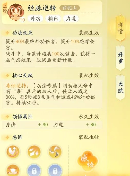 然后来详细说说搭配思路。任何流派的搭配,都应该尽量发挥功法性能为前提。我们先来看看白驼山的外功功法【经脉逆转】