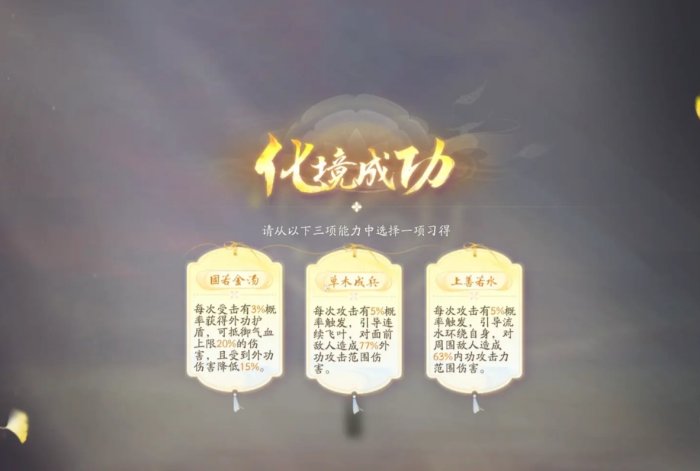 通关后我们成功突破化境啦,直接给我们三个天命内功让我们选择,这里大家根据自己攻击习惯选择就好了。