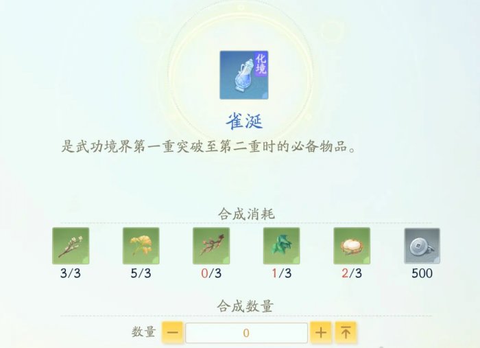2、雀涎获取:需要多数材料合成(皓雪梅*3长庆楼屋内采集)(朱砂梅*3长庆楼屋内采集)(醉王孙*3城内落叶处可采集)(地锦*3王二脚店屋顶采集)(白额雁蛋*3灵水院屋顶采集)(500碎银)