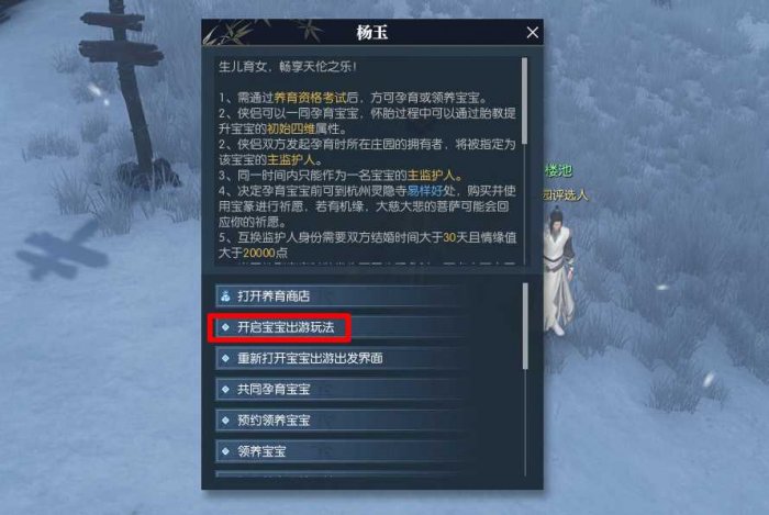 ②出游玩法:需要至少2个人组队,来到队长庄园,队长点击开启宝宝出游玩法即可开始宝宝出游。