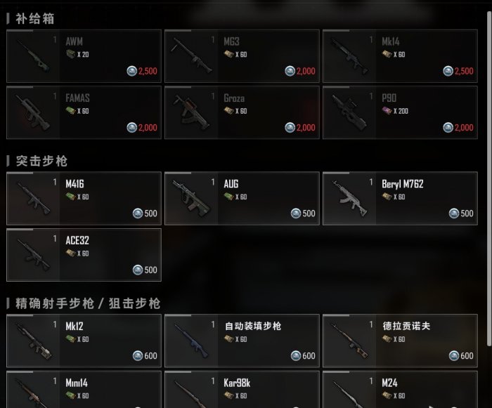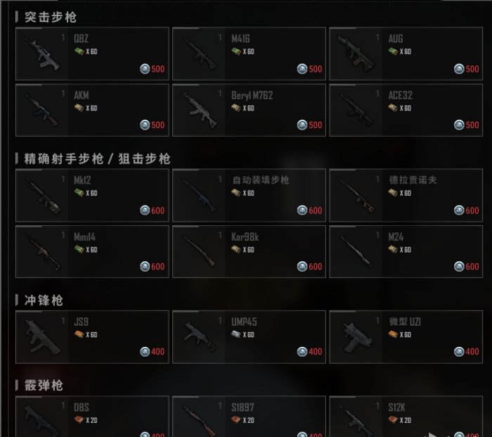 加入了急救包150BR币和饮料100BR币。加入的武器售价:QBZ、AKM和M249的售价都是500BR币,UMP45、UZI和S12K都是400BR币。