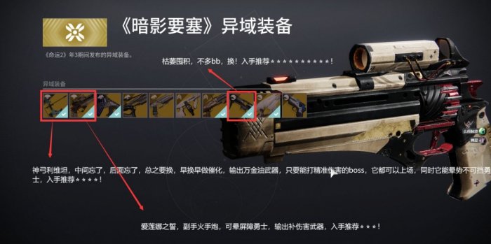 年三,暗影要塞,如果你是猎人,过主线获取猎人头部金装”刺客风帽“。主线之后接任务打地牢异端深渊获取”异星噬菌“,简称”机炮“。接隐藏任务神性前置,打突袭黑暗花园获取”神圣裁决“追踪步枪,噶殿必备金枪。