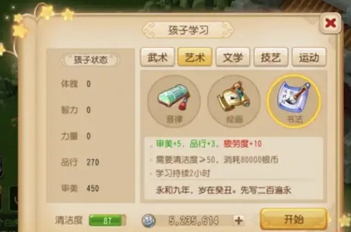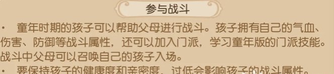 3、幼年时期:这个时期是整个子女养育过程中最为关键的时期,也是决定未来孩子各项属性的关键,花费也是各有不同,可以根据未来想要拜入的门派选择对应的培养方向(这里只是简单叙述,后面会详细说明)