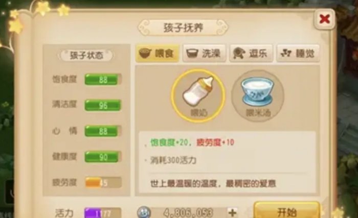 2、婴儿时期:这个时期主要的花费就在孩子的各项状态(饱食度、清洁度、心情、健康度、疲劳度、生病和治疗)上,如果时间多且心思比较细可以用银币提升各项状态,如果嫌麻烦也可以用金币一步到位。