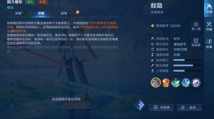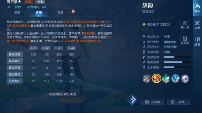 一技能,薄日掌火,主要输出技能,释放后能提升普攻伤害,并获的火龙印记。接下来敖隐能释放附带真实伤害的强化普攻。