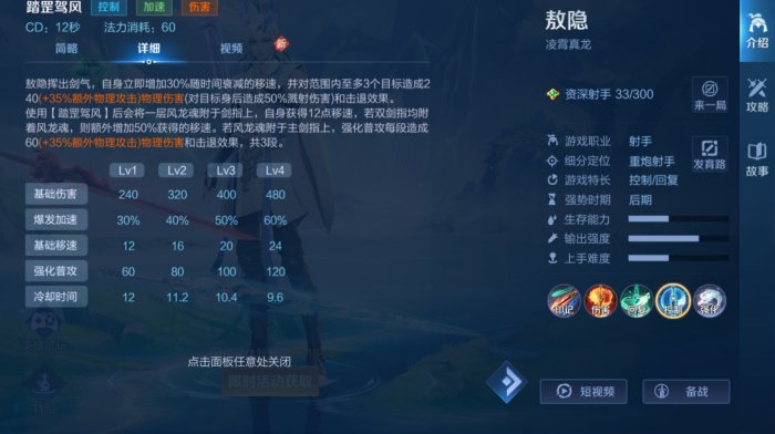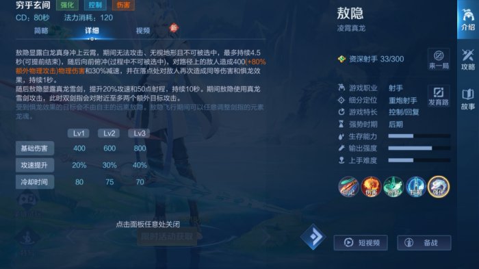 四技能,也就是大招,穷乎玄间,释放后变为真龙形态,其间无视地形,且不可选中(注意这个,这意味着什么?就是这段时间你是无敌状态),落地时造成范围控制(虽然这里说是范围控制,但是其实也在伤害,如果是残血或者是丝血的话,基本上就是可以秒掉)并提升接下来一段时间内,敖隐的攻速和普攻伤害。该技能可用来躲避敌方技能,对战中被若先手,可开四技能躲避敌方技能,再利用落地时的群体控制反打。