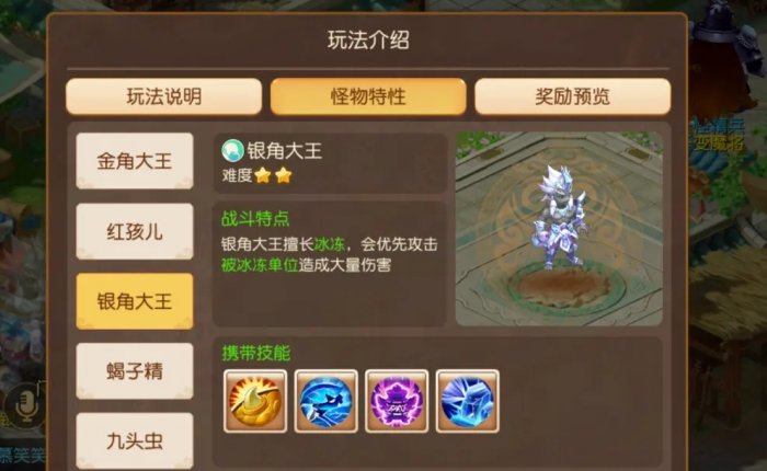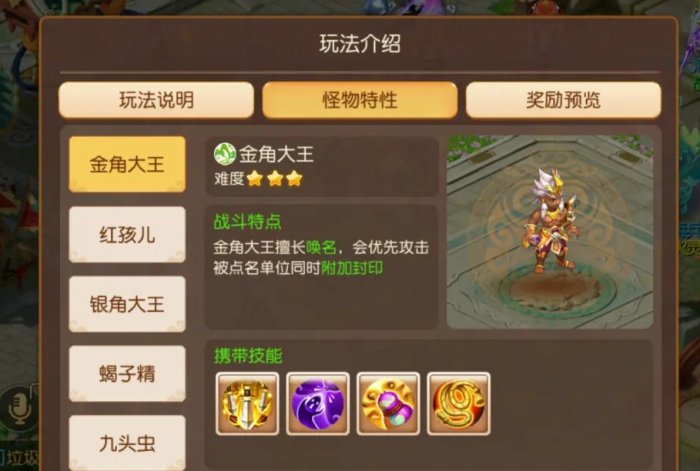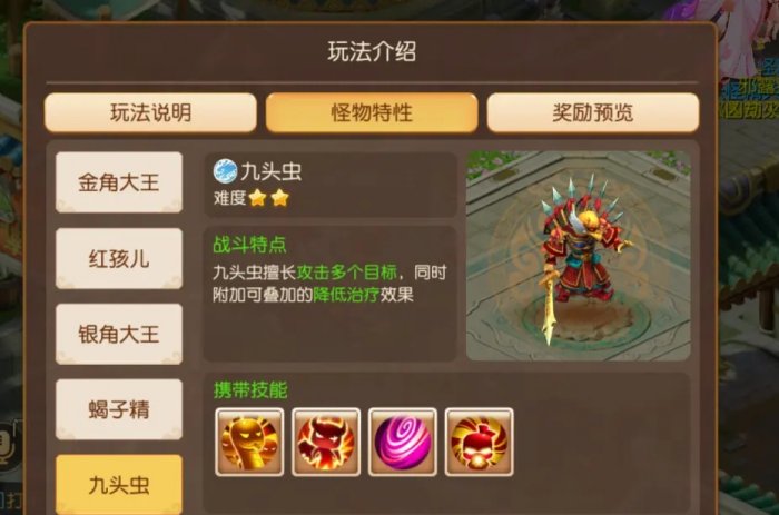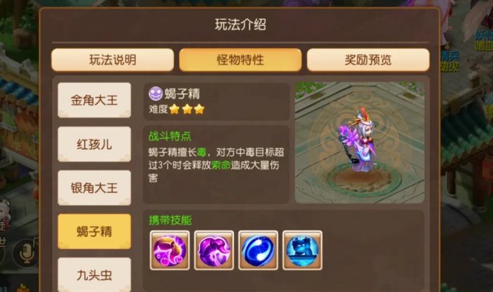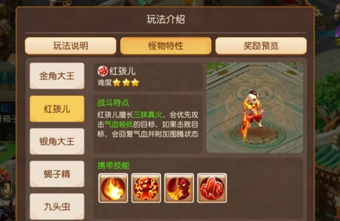 大妖一共有五种类型,会在刷新时随机刷新其中三只,分别是红孩儿、金角大王、银角大王、蝎子精和九头虫,大妖拥有特殊技能,这些技能基本与助战的技能一致。