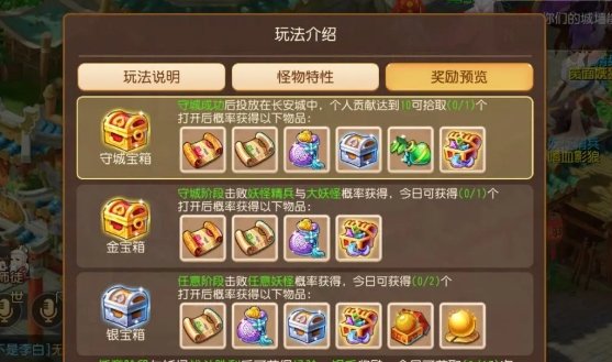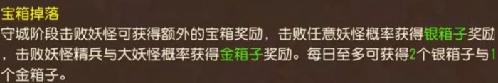 守城阶段击败妖怪可获得额外的宝箱奖励,击败任意妖怪概率获得银箱子奖励,击败妖怪精兵与大妖怪概率获得金箱子奖励。每日至多可获得2个银箱子与1个金箱子。
