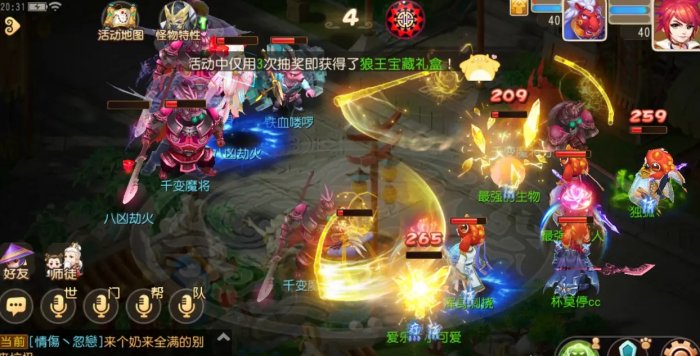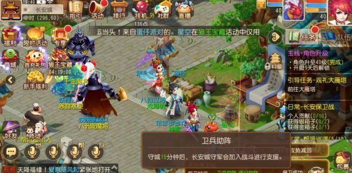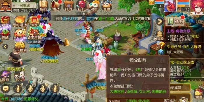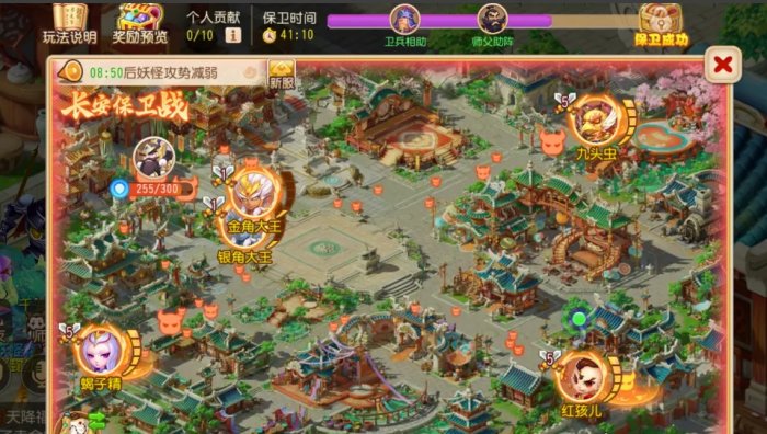 从长安城的三个方向会刷新小怪和大妖两种怪物,并且他们会朝着长安城皇宫不断进发,在这个过程中玩家可以点怪进入战斗(但是由于新区人比较多,点怪速度对于队长是一个考验)。