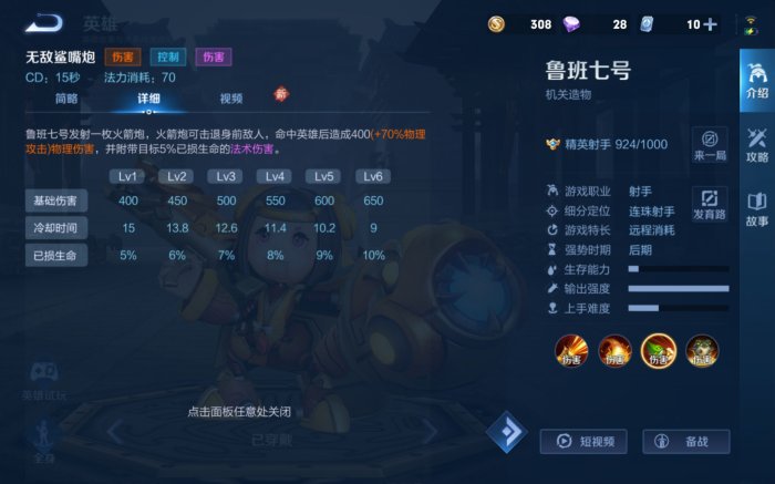 鲁班七号发射一枚火箭炮,火箭炮可击退身前敌人,命中英雄后造成400(+70%物理攻击)物理伤害,并附带目标5%已损生命的法术伤害。