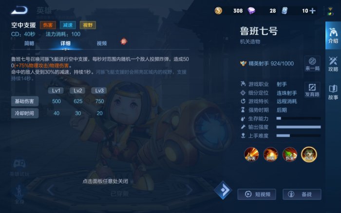 鲁班七号召唤河豚飞艇进行空中支援,每秒对范围内随机一个敌人投掷炸弹,造成500(+75%物理攻击)物理伤害。