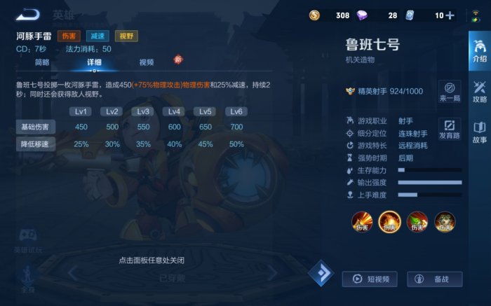 鲁班七号投掷一枚河豚手雷,造成450(+75%物理攻击)物理伤害和25%减速,持续2秒;同时还会获得敌人视野。