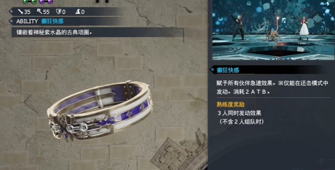 效果是“癫狂快感”,能够赋予所有伙伴急速效果,但仅能在还击模式中发动。消耗2ATB。