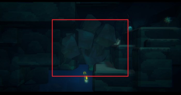 观察石堆,石堆左下方有一条满是水母的通道,顺着通道走,拔出钢桩