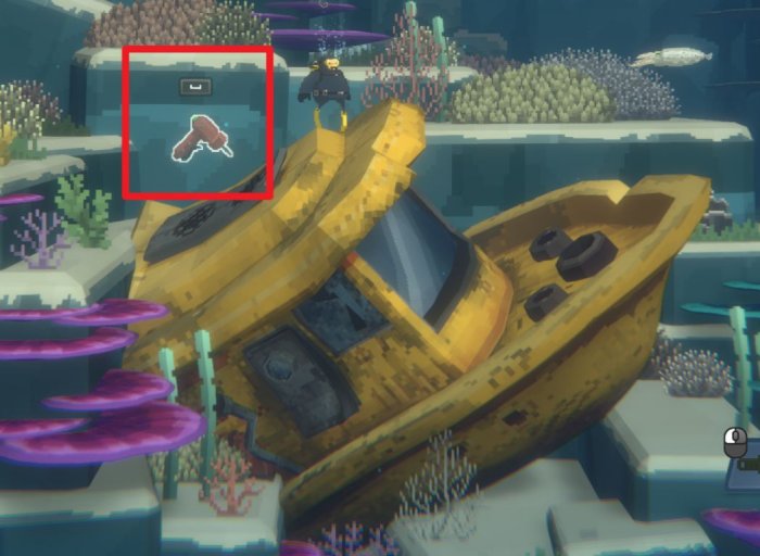 按照任务“达夫的粉色快递”路线找到沉船,地图不同可以多次下潜刷新,同一张地图,沉船位置也会不同,但是大差不差,在水下100米左右