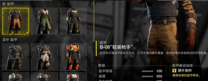 带这个甲因为盔甲等级和中甲一致,速度是轻甲速度。弊端是没有加成。带这个甲需要搭配战备蛋盾,可以挡一次坦克冲撞或者泰坦喷液,隐身虫两刀。
