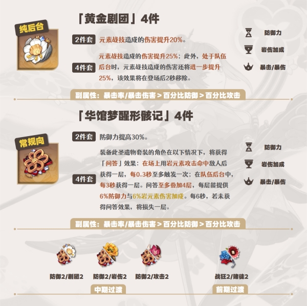④中期过渡可在“剧团/岩伤/防御”等2件套散搭中考虑,如果有词条优秀的攻击2件也可以暂时选择。