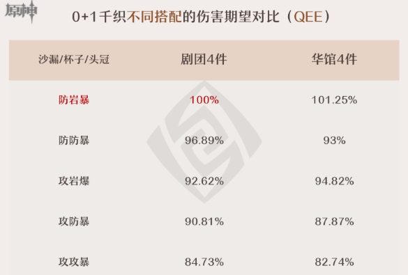 单纯后台用剧团,兼顾大招用华馆,两者差距并不大,谁词条好就选谁;剧团逐影本更广泛,华馆海染本刷取较少;6命优先华馆4件,照旧防御沙漏、岩伤杯、双暴头。