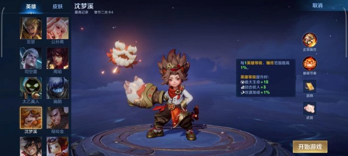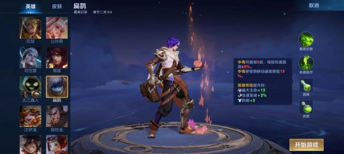 扁鹊是目前测试过的通关最简单粗暴的,远程攻击,而且范围非常大,毒还能扩散,武器升级到最后遍地都是毒,我们不需要担心打不到人或者是boss,远距离稳定输出,而近战英雄打boss会比较难,贴脸很容易吃满伤害瞬间暴毙。而自身有加血技能,升级加生命值和防御,道具选一点回血和闪避什么的坦度非常高,是通关的首选。