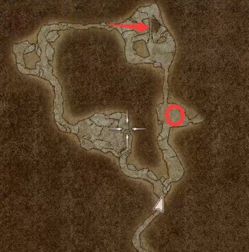 岔路口走右边会简单一些,在下图圈出的位置开宝箱得到双手剑,从下图箭头位置下去到底层的洞里开宝箱得到大杖。