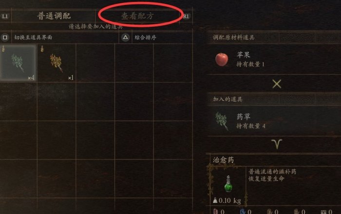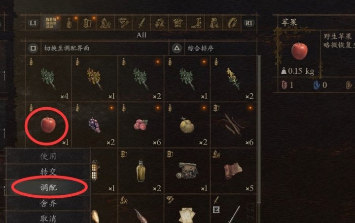 在物品栏选中一项物品,可以看到“调配”菜单。